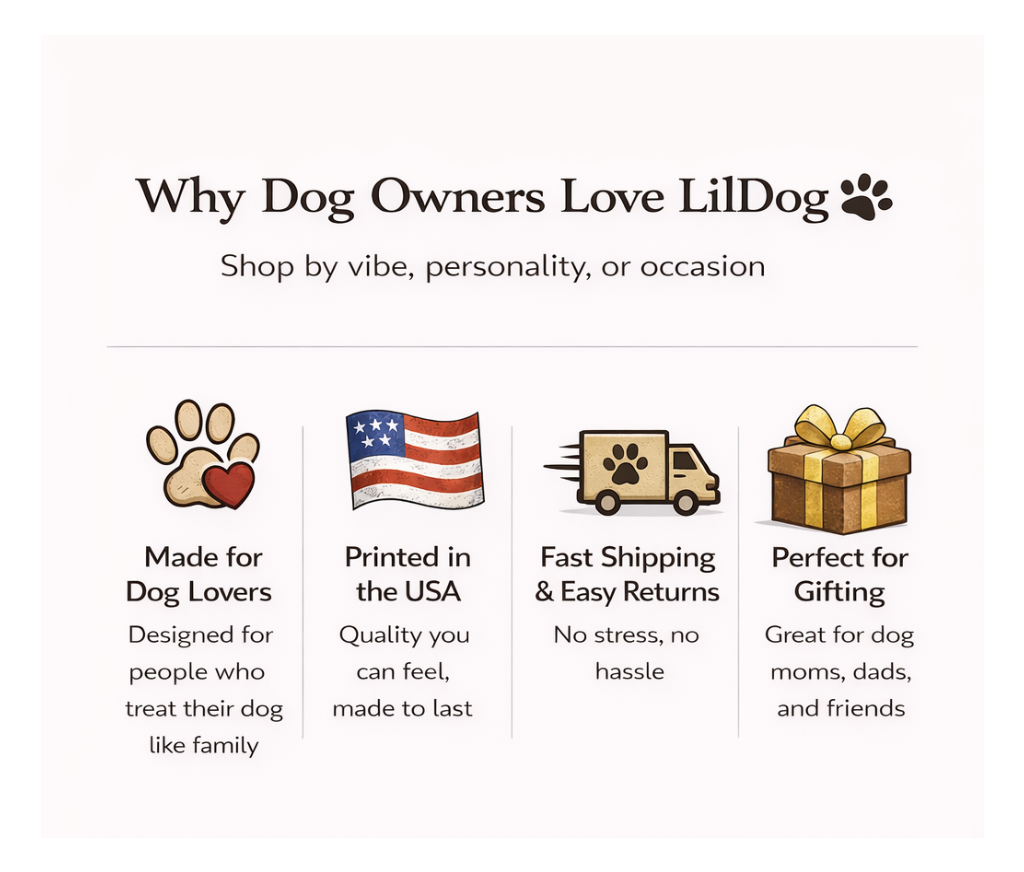 LilDog is proudly based in Massachusetts, where I—Sammy, your Chief Excitement Officer—oversee all the important things like quality control and snack breaks. Your goodies are printed by my trusted partners located throughout the United States, so everything ships quickly and close to home. Once your order heads out, I’ll send a tracking number straight to your email so you can follow your package just like I follow squirrels. And just a heads-up—I don’t ship internationally yet, only within the U.S., but I’m working on growing the pack!”