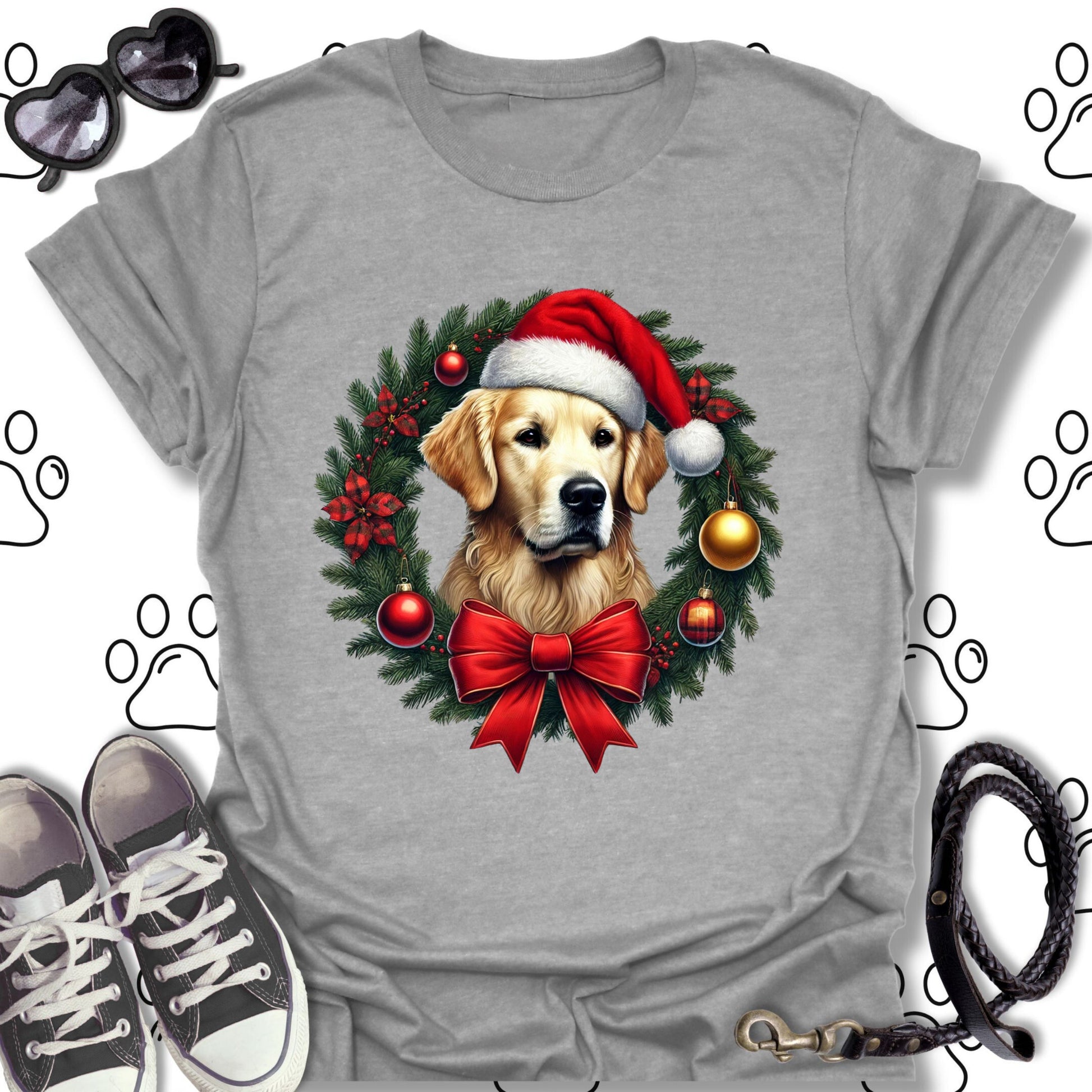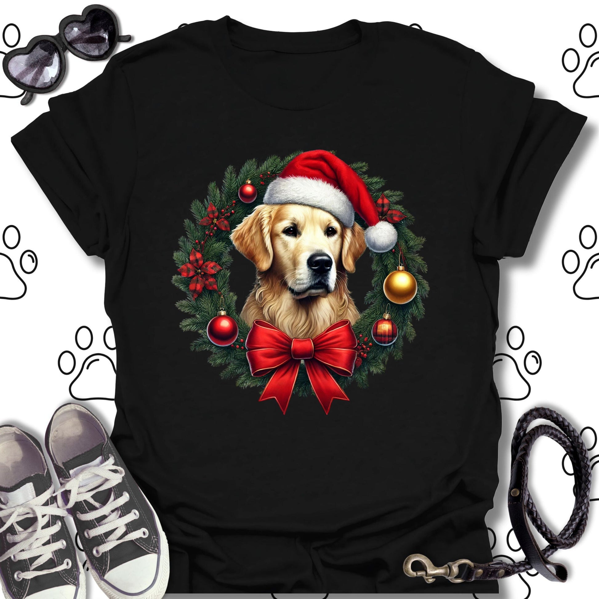 Celebrate the holidays in style with this charming Golden Retriever Christmas wreath t-shirt! Featuring a sweet Golden wearing a Santa hat surrounded by ornaments, holly, and a festive red bow, this design captures the warmth and joy of the season. Perfect for dog lovers, holiday parties, and cozy winter days, it’s a must-have for your Christmas wardrobe.